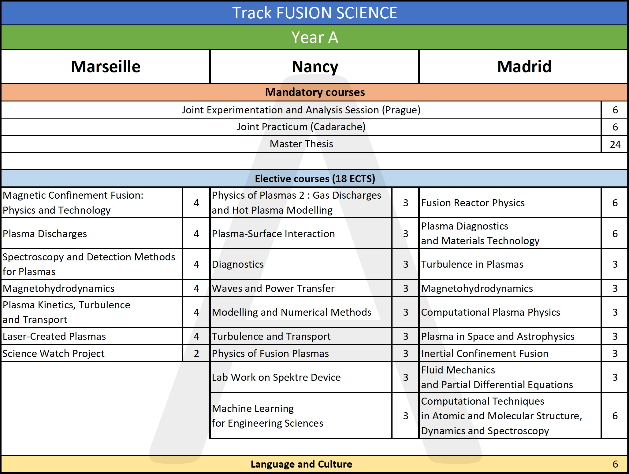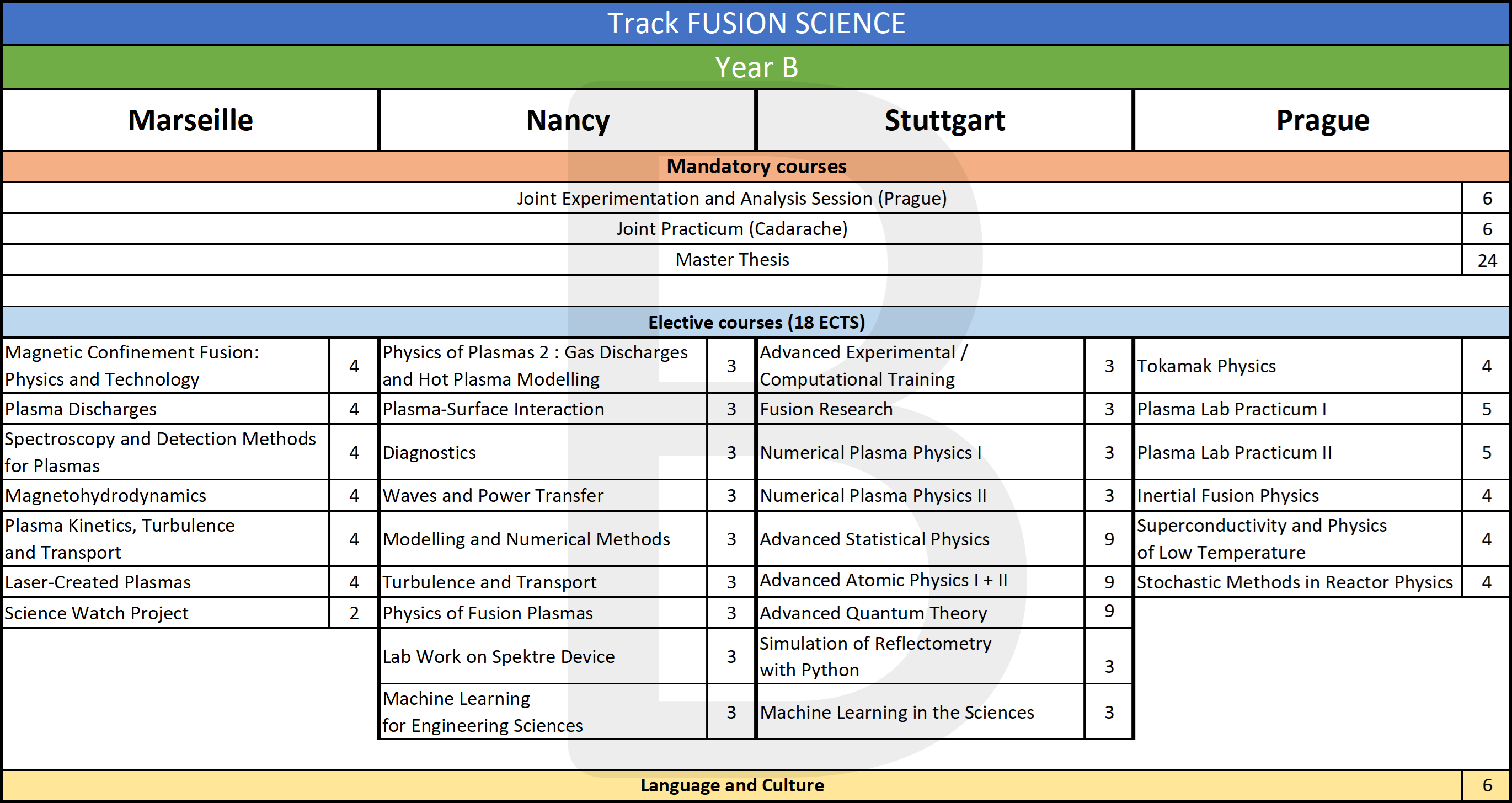 Starting from the academic year 2025-2026, students will choose between two tracks: Fusion Science or Fusion Technology. In both master years, they then study at a site where their chosen track is offered (see below) and take elective courses from that track. Hence, the programme offers plenty of room for personal interests, based a sufficiently broad, solid foundation of general courses.